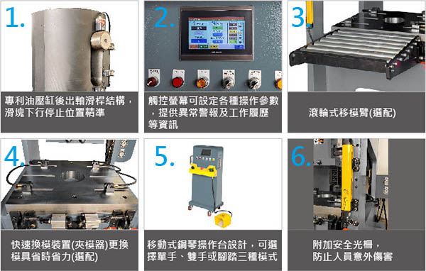 - 龍門式拉伸成型沖床可配合自動化系統之自動進、出料機械手操作、滾輪式移模臂、自動夾模器等裝置。